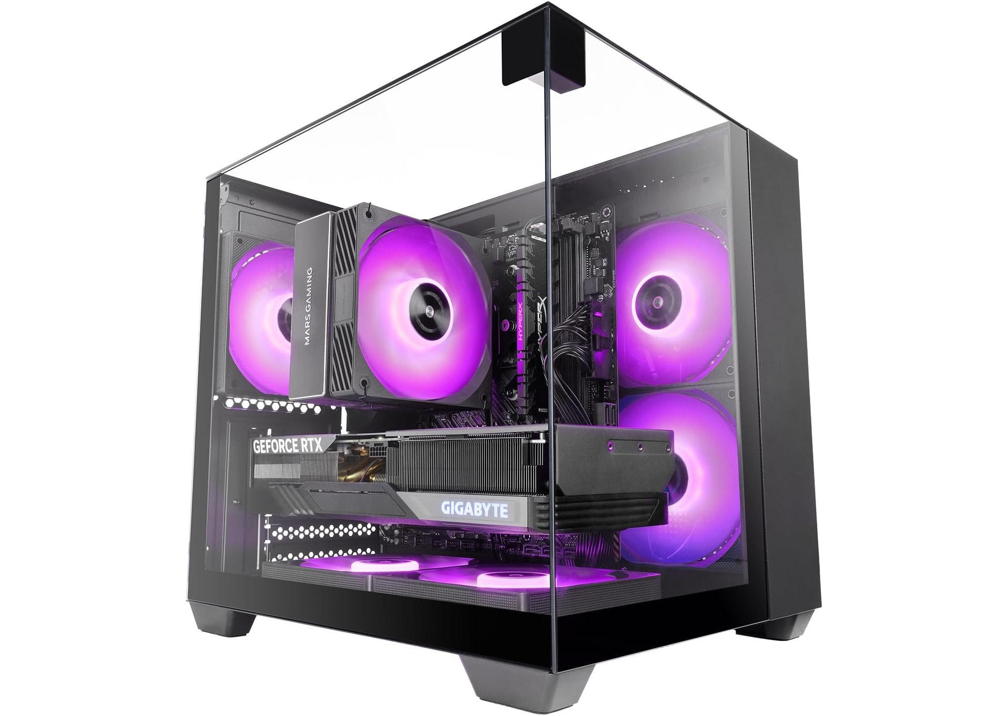 - Widok panoramiczny: potrójne szkło hartowane (front, bok, góra) bez łączeń dla czystej ekspozycji podzespołów.