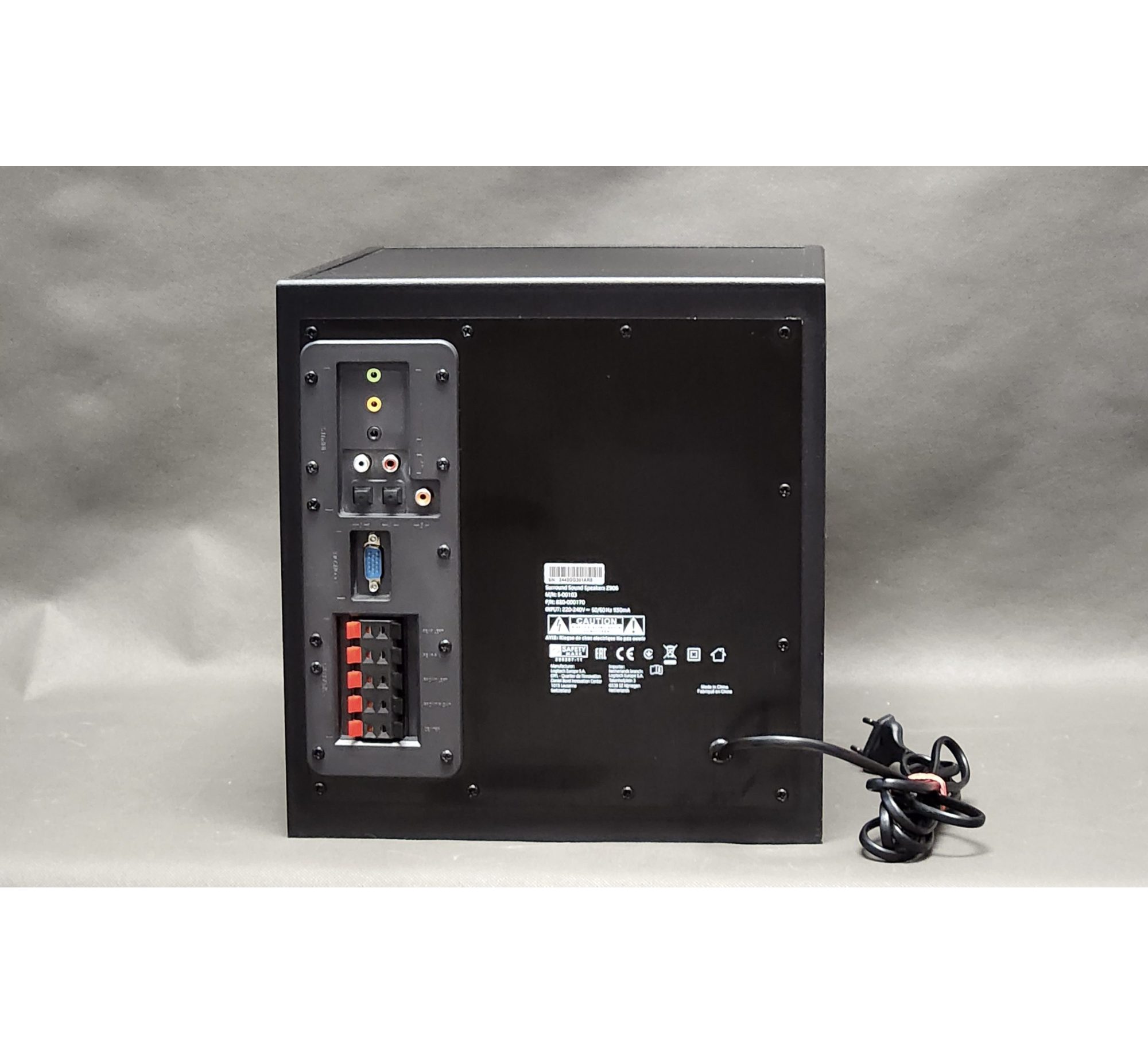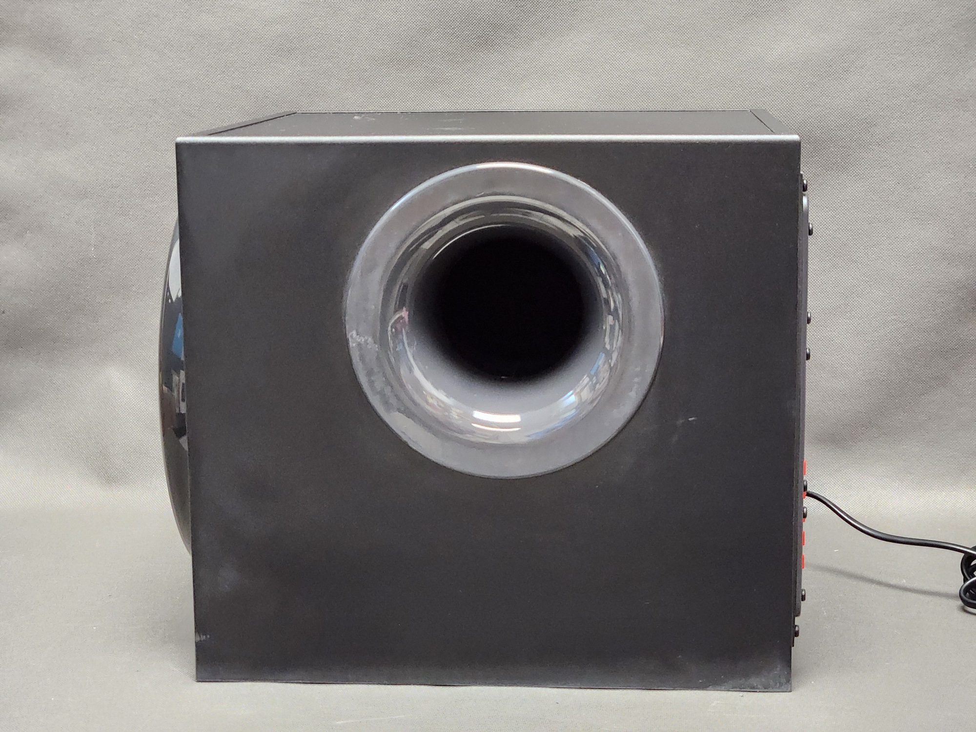 Stan: brak wyraźnych śladów użytkowania, lekkie rysy na subuferze, sprawne, opakowanie oryginalne, podniszczone
