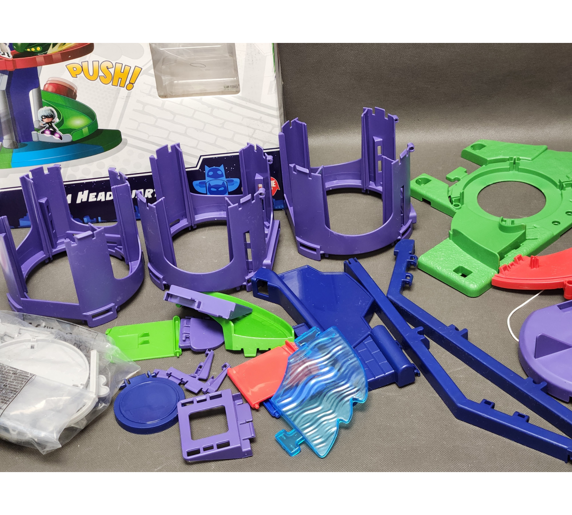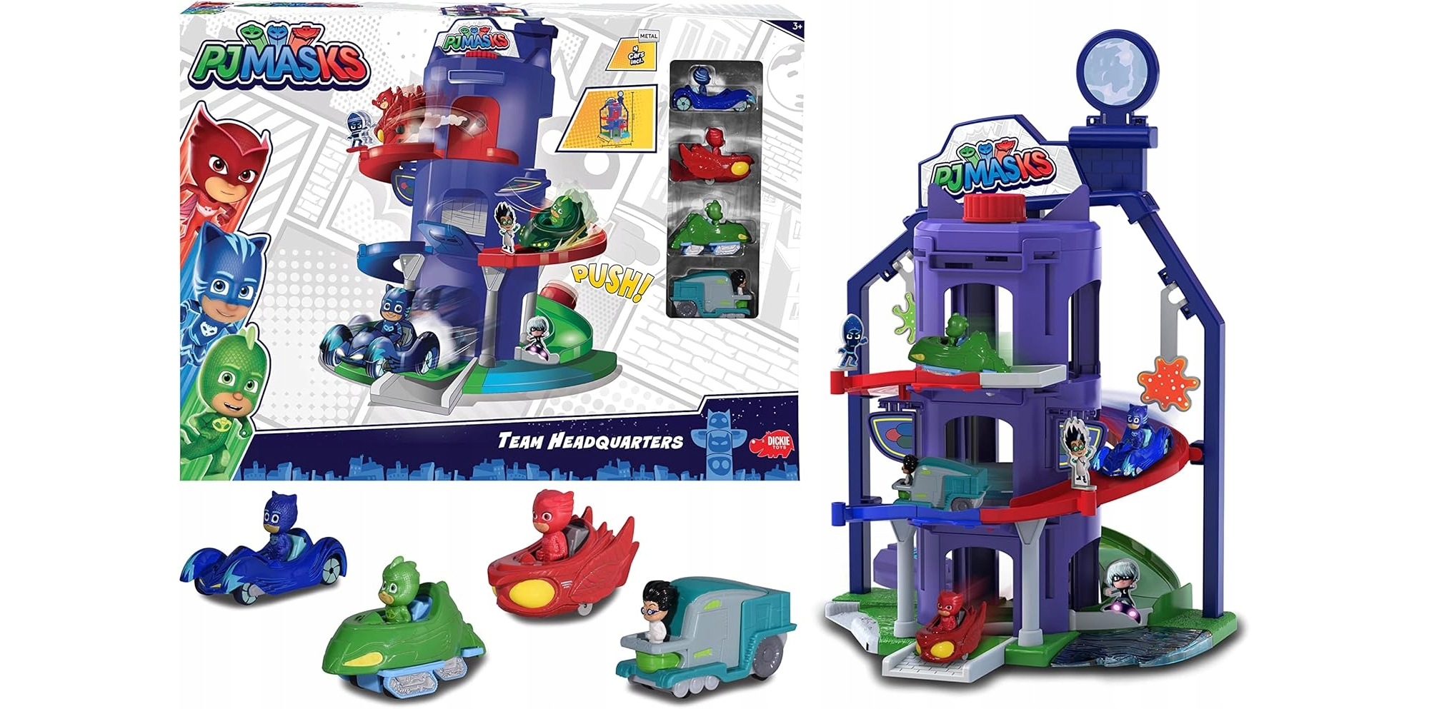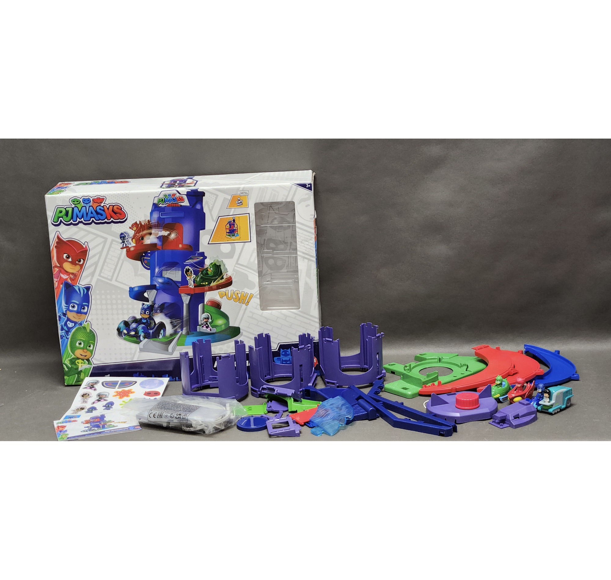 Wejdź do świata Pidżamersów i przeżyj niesamowite przygody razem z Kotboyem! Dwupoziomowa baza z torem zjazdowym wokół wieży zapewnia wiele emocjonujących scen. Na trasie czekają przeszkody, a na szczyt bohaterowie wracają dzięki wbudowanej windzie.