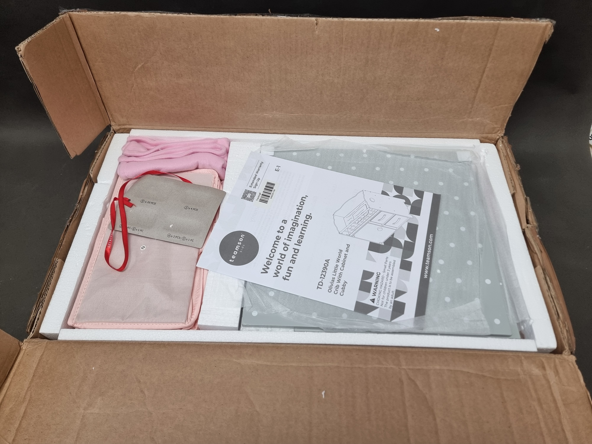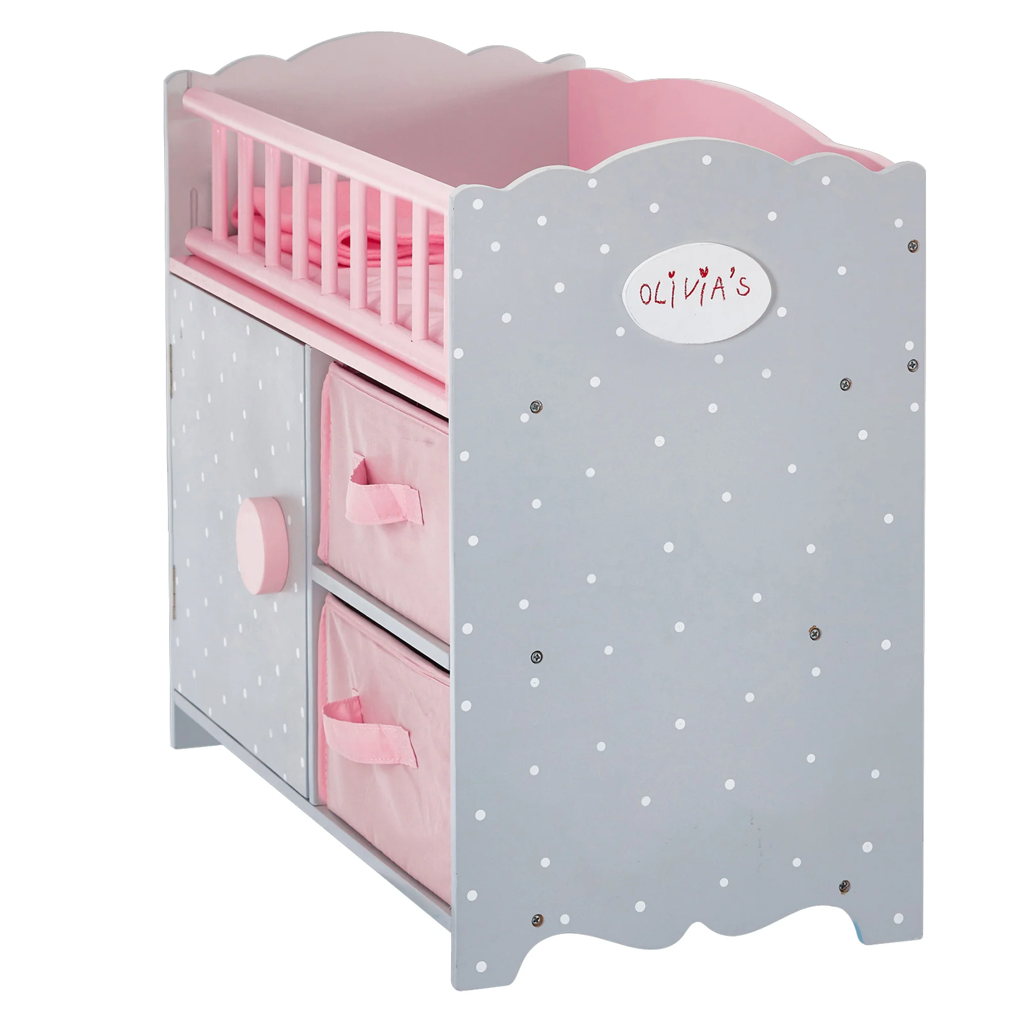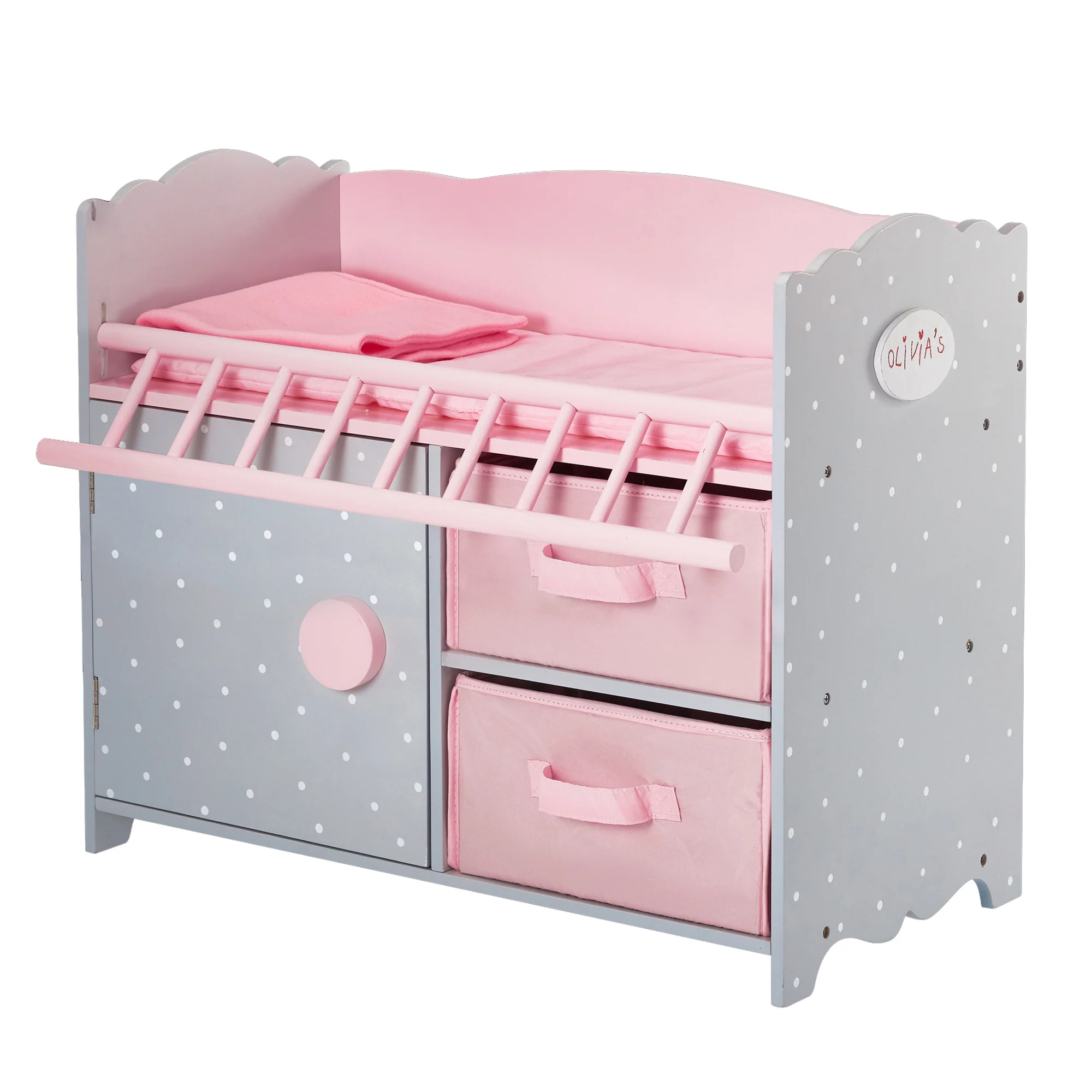 - Bezpieczne i funkcjonalne: zdejmowana różowa barierka, pasujący kocyk, szafka z drzwiczkami i 2 pojemniki na akcesoria.